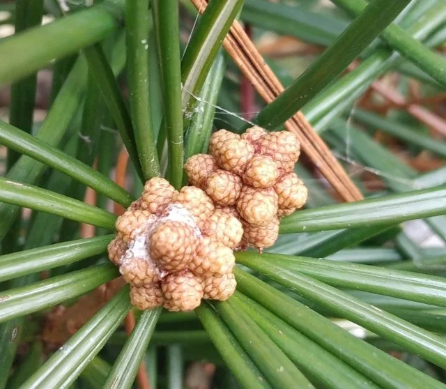10~11月にかけて、球果(まつぼっくりのような実)が熟し、黒褐色の種子をつける。種子は発芽率が低く、自然繁殖には時間がかかる。