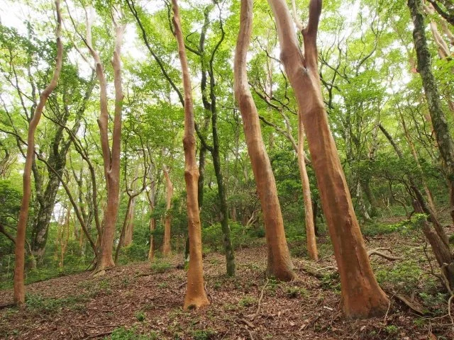 幹は滑らかな赤褐色で、樹皮が剥がれ落ちることで独特の風合いを生む。